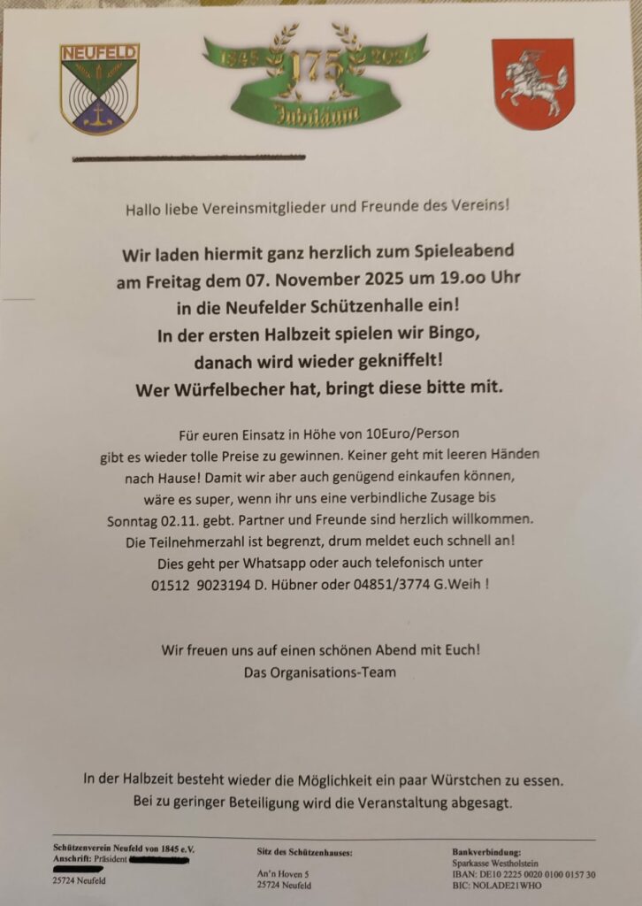 Wie in den Jahren zuvor veranstaltete der Schützenverein Neufeld einen Spieleabend. Es war ein gelungener Abend, an dem Vereinsmitglieder, Freunde und Bekannte teilnahmen. Viele freuten sich über ein Treffen mit alten und neuen Bekannten und dem dazugehörenden Klönschnack. Nachdem alle Tische besetzt waren, konnte es losgehen. Die Bingokarten vor sich, warteten alle voller Hoffnung auf die richtigen Zahlen. Besonders wenn volle Karte gespielt wurde und nur noch eine Zahl fehlte, wurden die Spielleiter angefleht doch endlich die richtige Zahl zu ziehen. Was für ein Spaß. Nach einer kurzen Pause startete ein neues Spiel. Die Kniffelbecher wurden rausgeholt und ordentlich geschüttelt. Immer wieder ertönte ein Jubel, wenn Kniffel gewürfelt wurde. Bei allen Spielen konnten sich die erstplatzierten über größere Preise freuen. Doch dank des Organisationsteams ging jeder Teilnehmer mit einem kleinen Geschenk nach Hause. Alle freuen sich daher auf ein nächstes Mal.