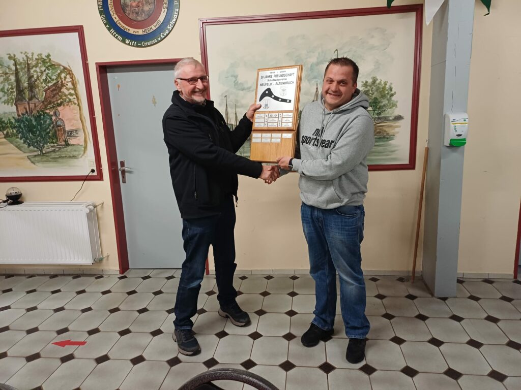 Präsident Dennis Hübner gratuliert Jan Gerdsen zur Wahl des 2. Scheibenmeisters